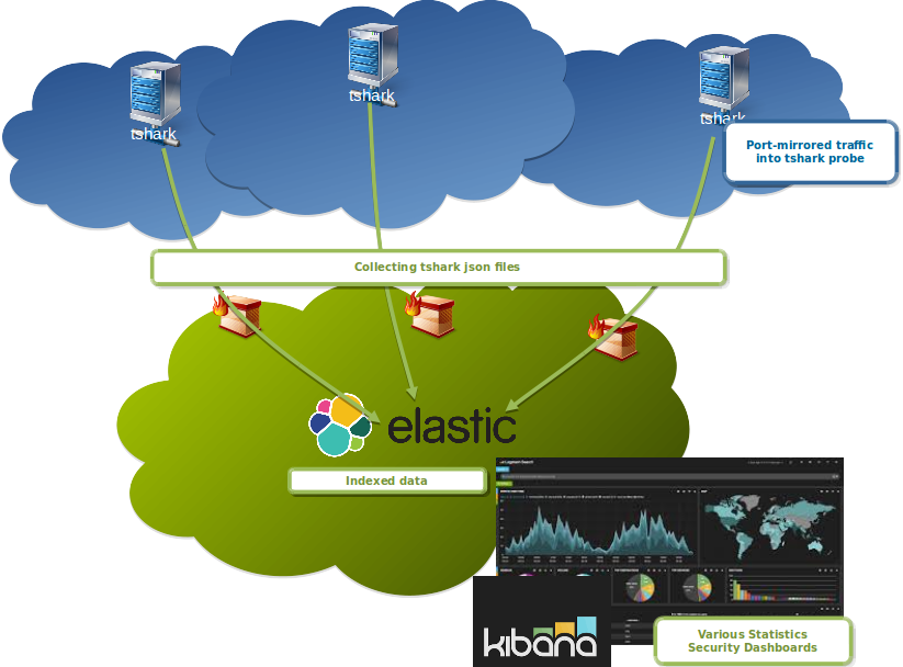 - Collector downloading over SCP or sFTP the files from tshark probes or directly using HTTP to push data into Elasticsearch